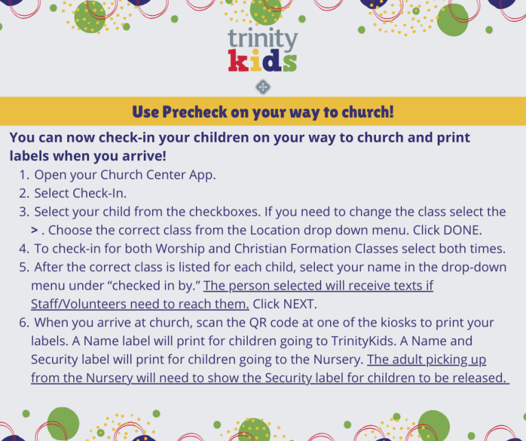 All children going to TrinityKids or the Nursery need to have a printed name tag before going to their class. You can check-in when you arrive at church or pre-check using the Church Center App. Please see instructions at the Check-In desk.